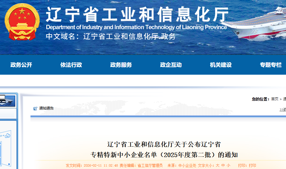 根據(jù)《遼寧省工業(yè)和信息化廳關(guān)于做好2025年度專精特新中小企業(yè)申報(bào)工作的通知》(遼工信明電〔2025〕2號),經(jīng)企業(yè)申報(bào)、各市推薦、專家評審、官網(wǎng)公示等程序,確定了遼寧省專精特新中小企業(yè)(2025年度第二批)和通過復(fù)核的遼寧省專精特新中小企業(yè)名單(2025年度第二批)?,F(xiàn)將有關(guān)事項(xiàng)通知如下: